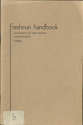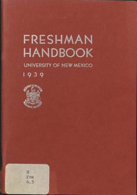 The first such handbook issued by the University of New Mexico, this introduces Freshman students to UNM. Some sections include information on head faculty, university history, campus organizations, honor societies, student registration and employment, fees, and regulations. Also includes the university calendar for the first and second semesters of 1930-1931.