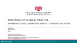 This workshop introduces healthcare providers, students, and residents to advanced clinical literature search techniques. It offers a step-by-step pathway for navigating evidence-based resources (PubMed, EMBASE, CINAHL, ClinicalKey, UpToDate, PsycINFO, ECRI Guidelines Trust, MedlinePlus, LexiComp), and emphasizes strategies for building effective search strategies. Participants will practice constructing keyword-based and subject-heading-based searches, employing Boolean operators, truncation, wildcards, exact phrase searching, and proximity operators. The session highlights saving strategies, setting search alerts, and integrating search practices into clinical workflows. The presentation also reviews tools for full-text access, including LibKey Nomad, interlibrary loan, and proxy authentication. This hands-on session empowers participants to improve literature retrieval efficiency for clinical decision-making, research, and scholarship.